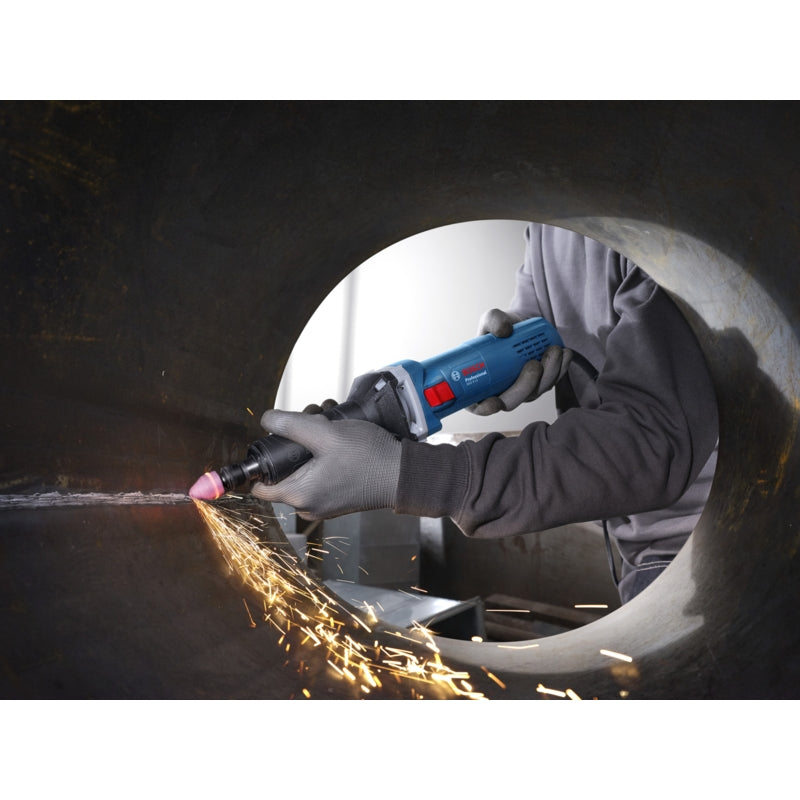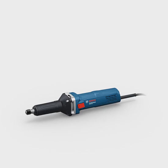 The Bosch GGS 5 LS Professional straight grinder is designed for metal workers and locksmiths, offering precise speed control for better tool handling. Its 550 W motor ensures high working efficiency, while the restart protection feature enhances user safety. This versatile tool is ideal for polishing pre-welding surfaces, fitting round pipes, material removal, deburring, and seam removal. The ergonomic handle, slim body, and front spindle provide comfortable operation and optimal access to tight areas. Additionally, spare parts are interchangeable with other Bosch angle grinder components.