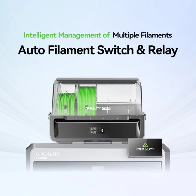 The included Creality Filament System (CFS) enables multi-material and multi-colour printing. By linking multiple CFS units, users can expand up to 16-colour printing. The K2 Plus features a flexible build plate, active chamber heater, chamber temperature control up to 60°C, and intelligent filament management with RFID-tagged filaments. Its powerful 1200W rating and high-speed capabilities of up to 600mm/s make it suitable for large and complex prints.