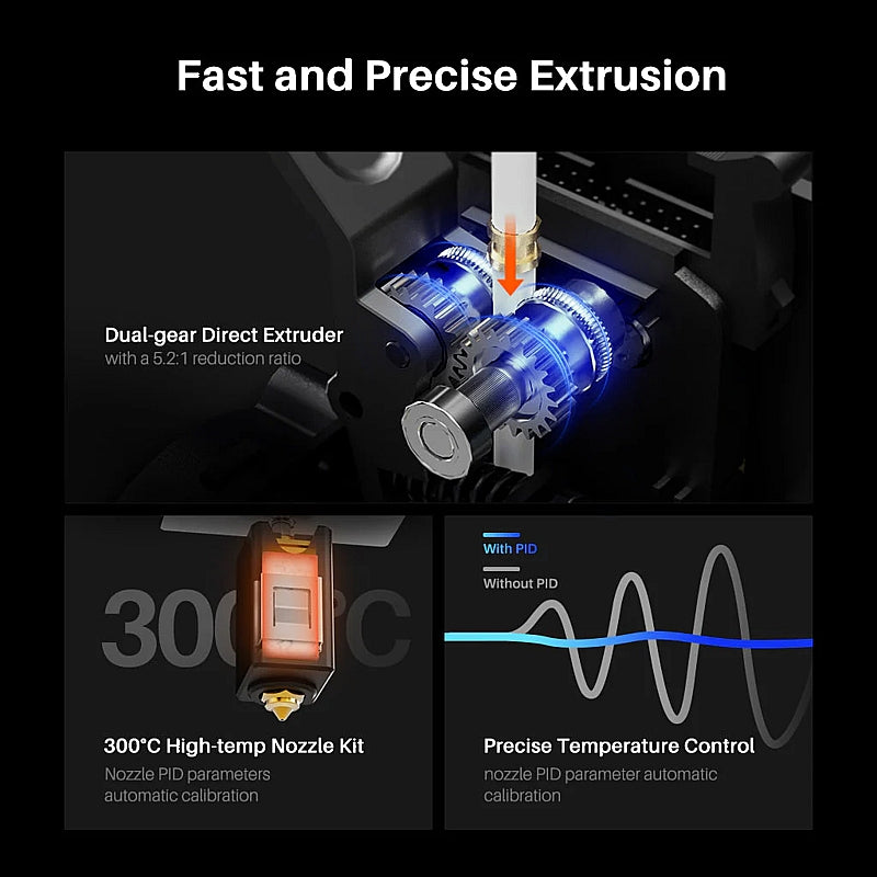 Cooling / Motion Design: Reinforced Y-axis, improved extruder drive, efficient cooling system
