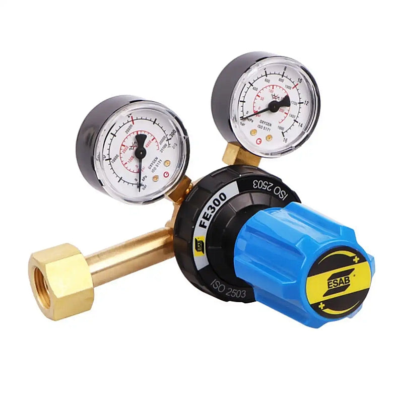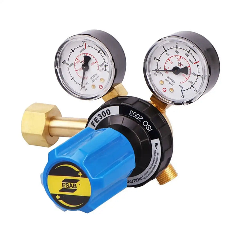 The ESAB FE300 Oxygen Gas Regulator provides superior precision, stability, and safety for various industrial gas applications. Engineers design this regulator in accordance with rigorous ISO 2503 safety standards, so it ensures reliable and consistent gas flow. Professionals rely on it for critical tasks such as oxy-fuel cutting, oxy-fuel welding, and arc welding. Moreover, its robust construction and user-centric features highlight ESAB's dedication to quality and operator safety. The regulator offers versatile compatibility through side and bottom entry options, which fit various cylinder valve types. Additionally, encapsulated regulating technology maintains precise and stable gas pressure control, while high-clarity pressure gauges and a gas colour-coded handwheel simplify operation. Manufactured in Europe, the FE300 combines durable materials with high-quality craftsmanship to minimise maintenance needs and operational costs. Consequently, users benefit from a cost-effective, user-friendly, and dependable solution for demanding technical gas applications.