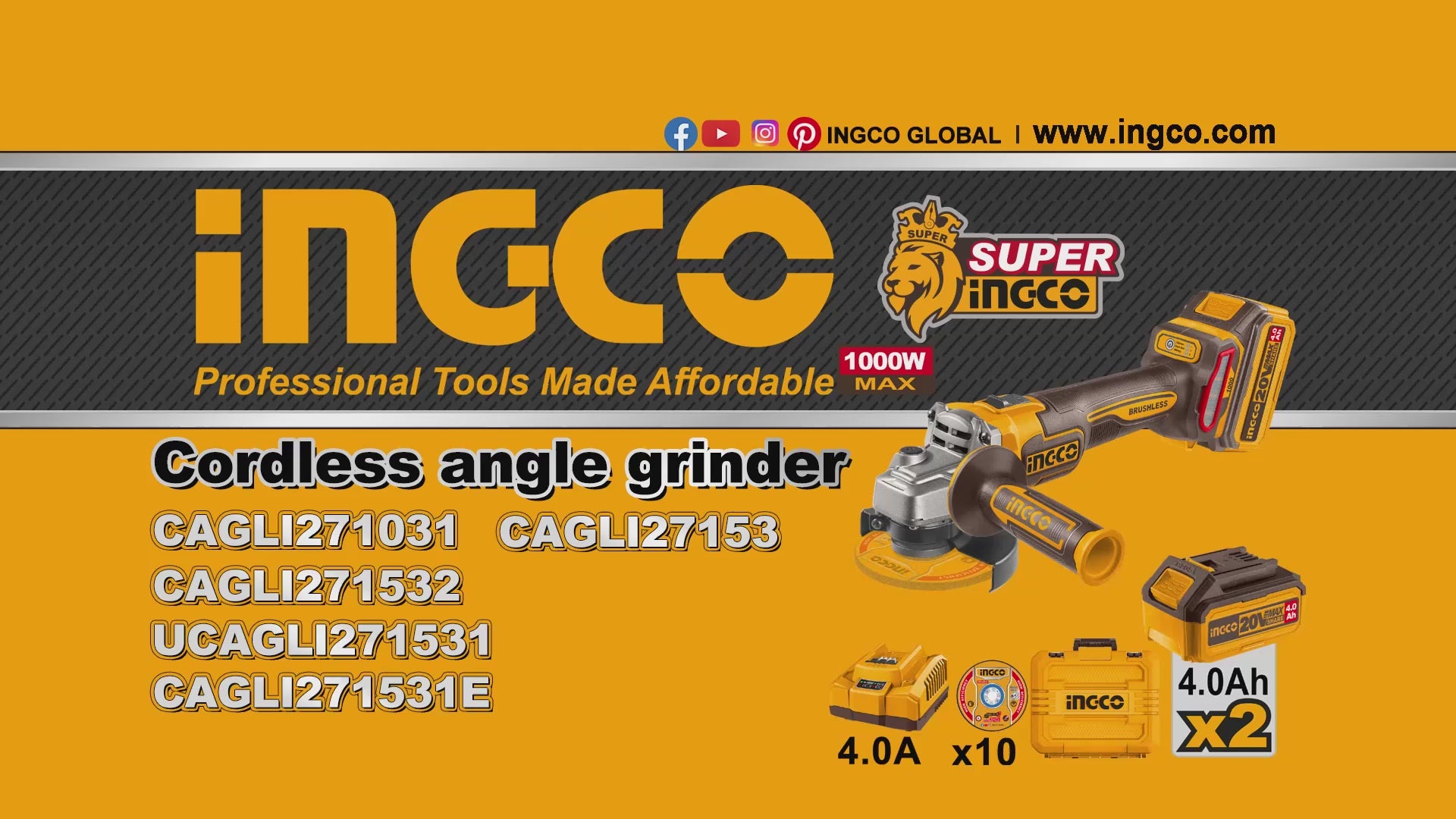 The Ingco 20V Brushless Cordless Angle Grinder is engineered for high performance and durability. Featuring a powerful brushless motor that delivers a maximum input power of 1 000W, this grinder ensures efficient operation and extended tool life. Its variable no-load speeds of 3 000, 6 000, and 9 000 rpm provide flexibility across a variety of grinding and cutting applications. The 115mm (4.5") disc diameter offers excellent control and precision, while the M14 spindle thread ensures compatibility with standard accessories. This complete kit includes two 4.0Ah lithium-ion battery packs, a charger, and a 10-piece abrasive cutting disc set, all conveniently packed in a sturdy carrying case for easy transport and storage.