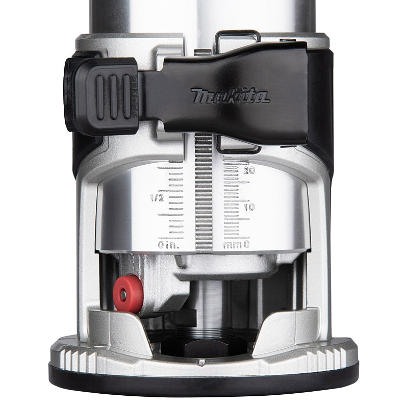 The Makita DRT50ZJ LXT 18V Cordless Brushless Laminate Trimmer offers professional precision for carpentry and hobby applications. This bare tool features a brushless motor that delivers 30,000 RPM for fast and efficient trimming while optimising battery energy use for longer run time per charge. The aluminium base provides higher durability and accuracy, while the plastic cover plate protects the workpiece from scratches. Conveniently located variable speed control dial allows users to match the speed to the application, and dual LED job lights illuminate the cutting edge for increased visibility. The smooth rack-and-pinion fine depth adjustment system enables precise settings, and the quick release cam lock system allows fast depth adjustments and base removal/installation.