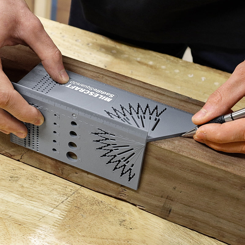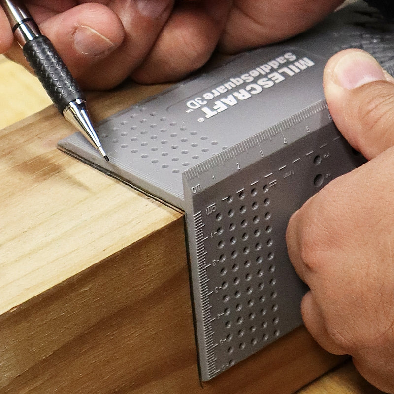 The Milescraft SaddleSquare3D™ is a pocket-sized workshop companion that makes transferring layout lines quick, accurate, and repeatable. Designed for use with a 0.9 mm mechanical pencil, this lightweight tool allows you to mark multiple faces of a workpiece with ease. It functions as two saddle squares in one: use one side to transfer precise 90-degree lines between adjacent faces, then flip it over to mark accurate 45-degree mitre lines. Additionally, the patent-pending angle guide lets you mark exact whole angles from 2 degrees to 83 degrees using evenly spaced guiding channels, ensuring consistent and reliable layout work.