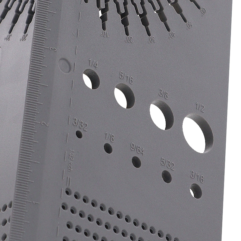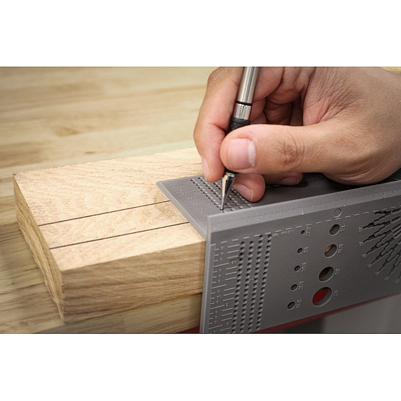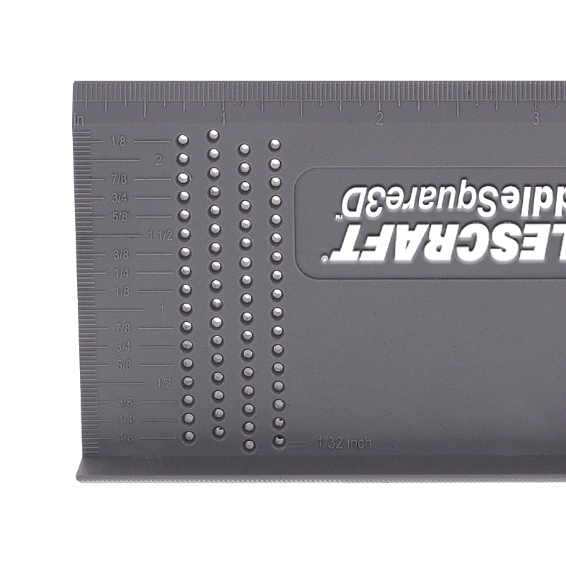 Furthermore, the SaddleSquare3D™ includes four integrated rulers with finely spaced markings, aligned with physical scribing guides. These guides eliminate freehand marking by physically guiding the pencil for accurate line placement. A built-in drill bit sizing gauge also helps identify worn or unreadable imperial drill bits, making this tool a practical all-in-one solution for everyday layout tasks.
