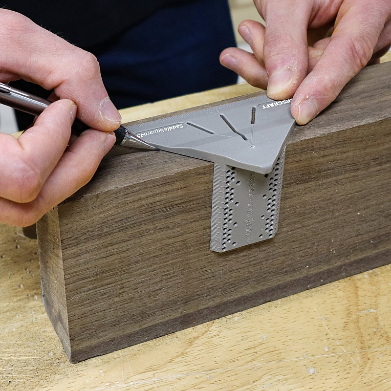 In addition, the SaddleSquare45™ includes integrated rulers with fine 1/32″ (0.8 mm) markings for detailed measuring and layout work. The zero-centred ruler extends 2-1/4″ (57 mm) to both the left and right of centre, improving alignment accuracy. Physical scribing guides, spaced at 1/16″ (1.6 mm), further enhance precision by guiding the pencil directly, thereby eliminating freehand errors. Compact, practical, and easy to store, this tool is an ideal assistant for miter and layout work in any workshop.