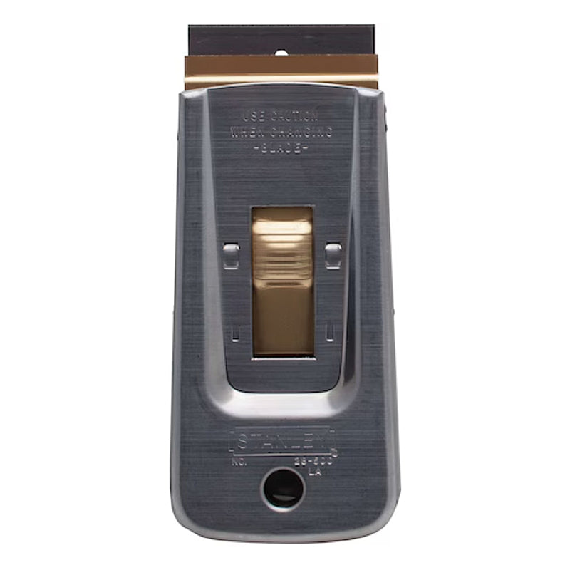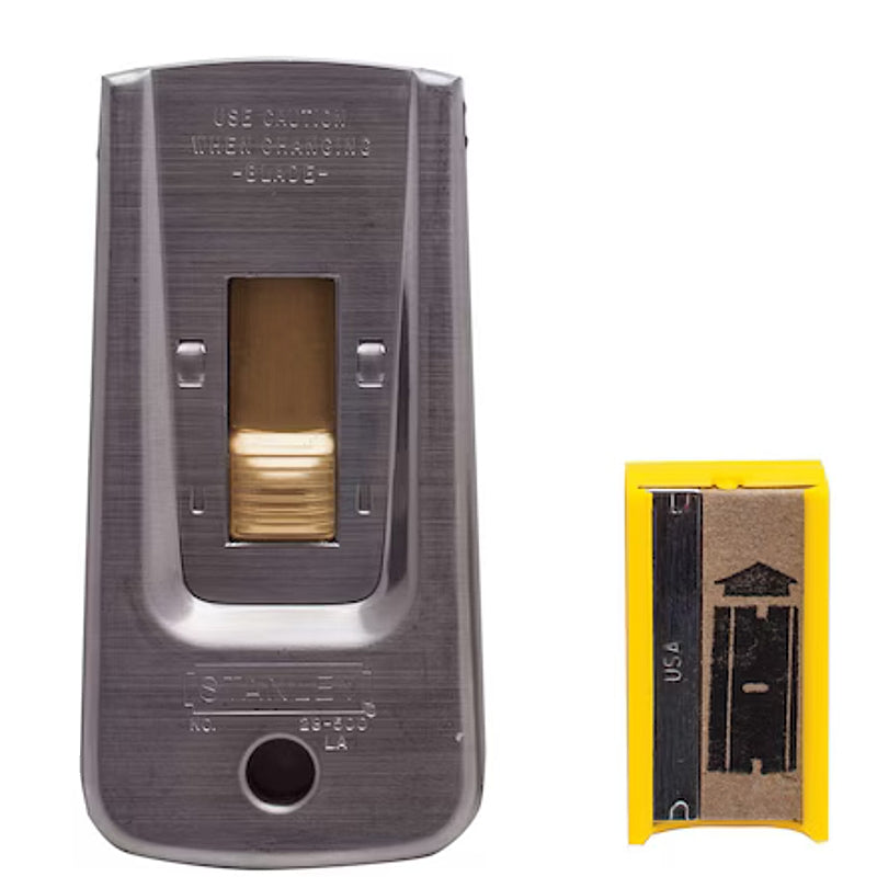 The Stanley Professional Glass Scraper 95mm x 40mm | 0-28-500 is a heavy-duty tool designed for industrial and professional use. It features a 40mm blade that removes paint, glue, putty, and other adhesives from various smooth surfaces including glass, tile, walls, and floors. The scraper includes a brass push button and comes supplied with a rectangular blade (11-515), ready for immediate use. Its retractable blade enhances safety between uses, while the metal body ensures durability and long service life. The scraper supports tool-free blade changes and is compatible with replacement blades 0-28-510 and 1-11-515, offering reliable performance for repeated tasks.