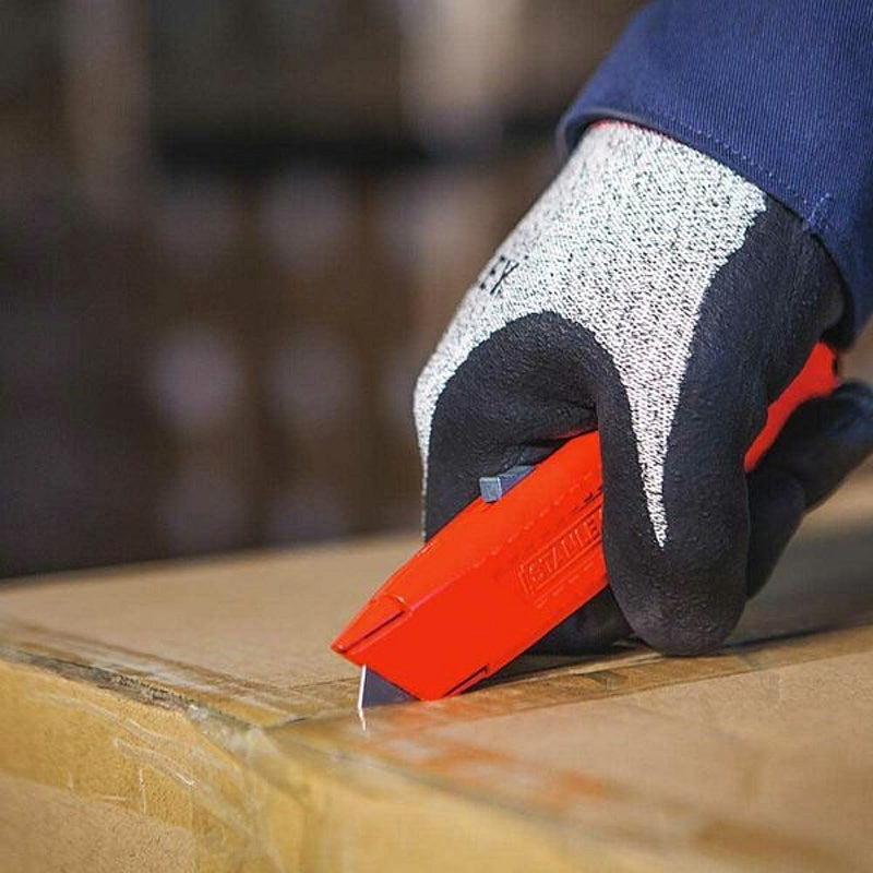 The Stanley Self-Retracting Safety Utility Knife (0-10-189) is designed for professional environments where safety is paramount. Its spring-loaded, rounded-tip blade retracts automatically when pressure on the slide button is released, reducing the risk of accidental injury. The knife features a bright red die-cast aluminium body for high visibility, combined with a contoured handle with diagonal ribs for slip-resistant grip and comfort. Additionally, it offers integrated blade storage inside the handle, allowing you to store up to ten spare blades conveniently. The interlock nose locking system further enhances safety during cutting, while the knife is supplied with one special round nose heavy-duty blade to get you started immediately.
