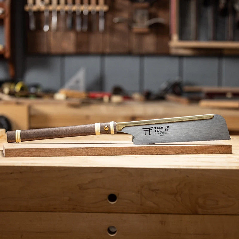 The Temple Tool Dozuki Pull Saw (D-240-R) is expertly crafted in Japan to combine traditional Japanese precision with Western aesthetics. Designed with a 240mm (9.5") high-grade SK85 Japanese tool steel blade, it features fine 18 TPI rip-cut teeth for ultra-smooth and accurate rip cuts, ideal for dovetails, tenon cheeks, box joints, and other detailed woodworking tasks. The blade is supported by a solid brass back with brass hardware, ensuring sturdiness and easy blade replacement. Its handle, made from Japanese Wingnut wood with natural rattan wraps, offers both comfort and a secure grip. The blade’s rounded end quickly distinguishes it from the crosscut version with a squared end, making it easy to select the right saw for the task. This saw is suitable for both beginners and professionals seeking a dedicated fine rip-cut tool.
