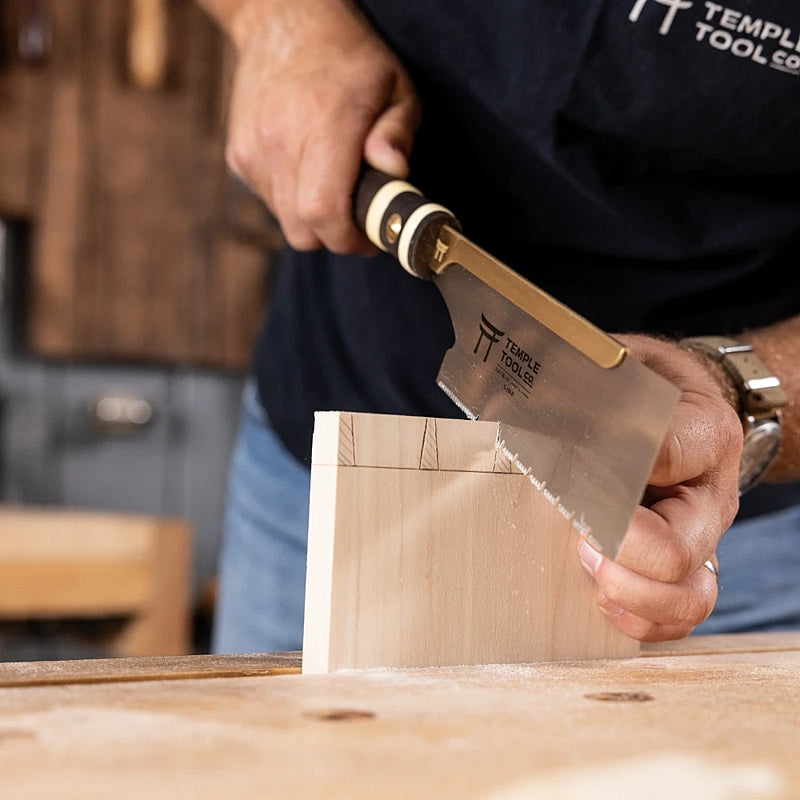 The Temple Tool Dozuki Pull Saw (D-150-D) is a compact, versatile Japanese saw designed for both beginners and experienced woodworkers. Its 150mm (6") SK85 Japanese tool steel blade combines crosscut and rip teeth, allowing fast, accurate cuts in multiple directions. The repeating pattern includes a special “demon” rip tooth (Oni-Ba) with a deep gullet for efficient waste removal, earning it the nickname “Little Demon” Saw. This design ensures smooth starts and controlled cutting for small to mid-sized joinery projects, including dovetails, Kumiko, and tenons. The blade is supported by a premium solid brass back and secured with brass hardware, enabling easy replacement. Additionally, the handle crafted from Japanese Wingnut wood with natural rattan wraps provides comfort, grip, and visual appeal. Expertly crafted in Japan, this saw blends legendary craftsmanship with Western aesthetics for reliable, precise performance.