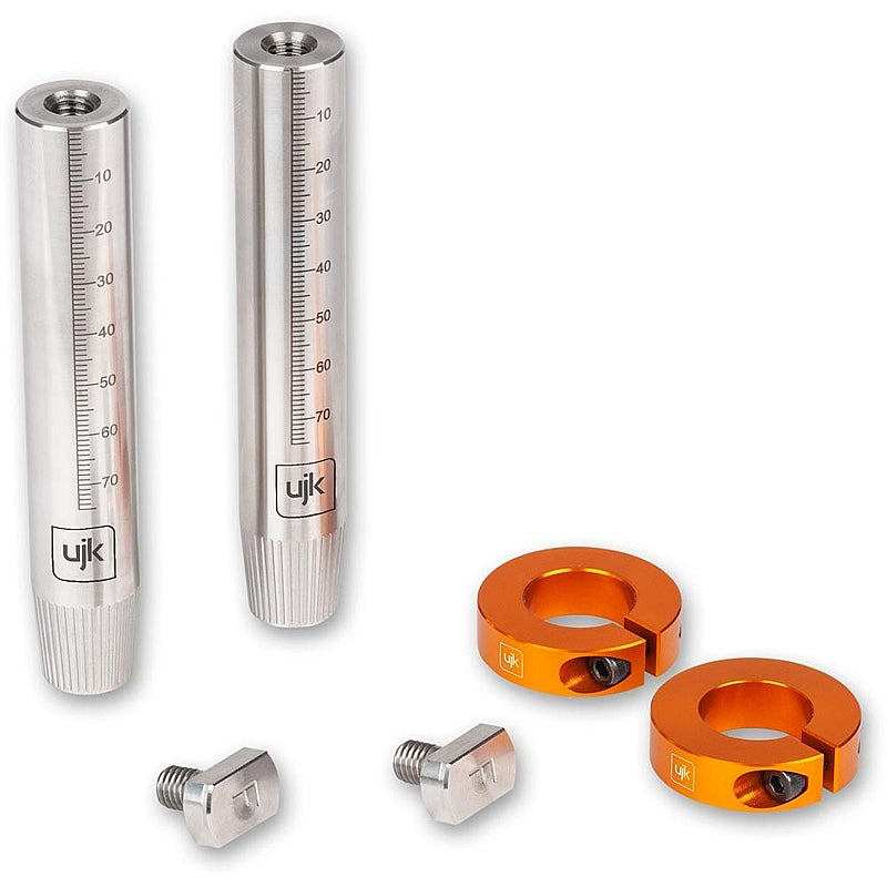 They are supplied with two aluminium split collars which fit over the dog. If the workpiece you are cutting is narrow, the rail can rock. These collars support the rail to stop this rocking. The dogs have a metric scale 75mm along the side. This scale is used to measure the thickness of wood and then set the collar on the dog to the correct thickness for support. A final feature is the straight knurl on the leading taper. This assists when threading the Tee-bolt (which is in the rail) to the dog.