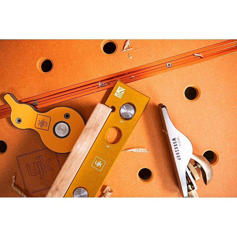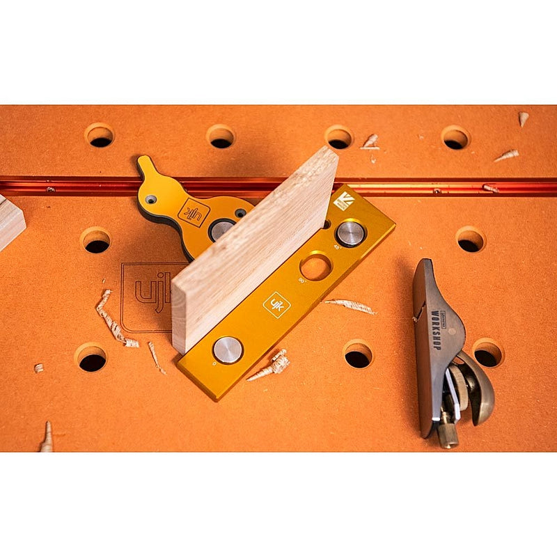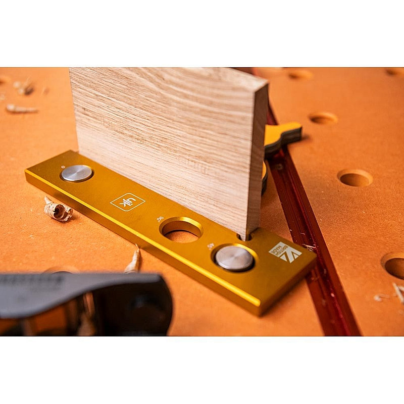 The UJK Hook Stop stands out with its unique hook feature, ensuring your material is located easily and stays put for the most precise work. It's a modern evolution of the traditional bench stop, with one round hole and two elongated for use with an MFT workbench. The three holes also enable 45° usage, adding to its handiness.