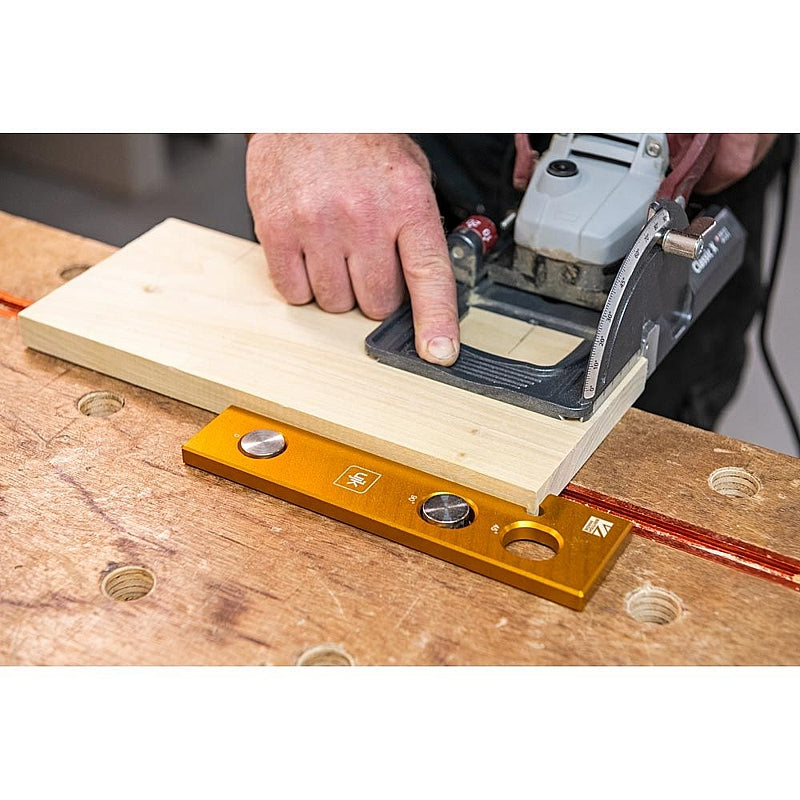 Compatible with hand planes and power planers, biscuit jointers, and the Festool Domino. It allows for vertical and 45° planing against the body. For secure clamping, pair it with UJK Cam and Wedge Clamping Set and for thicker wood, simply stack multiple stops for a firm hold.